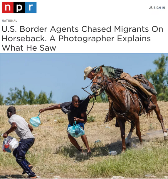 △美国全国公共广播电台(NPR)报道截图:美国边境巡逻队成员骑马挥鞭在格兰德河沿岸追逐手提食物的海地移民。