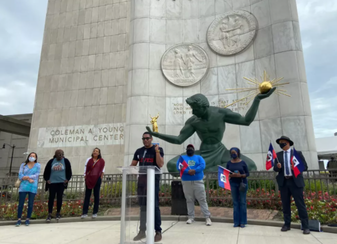 9月26日,一些底特律市民聚集在市中心的广场,手举海地国旗及写有“拜登,停止暴行!停止驱逐!”的标语,要求拜登政府接纳边境地区的移民,并为其提供食物、饮用水等生活必需品。