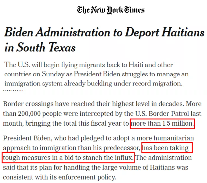 据《纽约时报》报道,8月起,每天都有数以千计的海地人穿越格兰德河到达美国。美国边境巡逻队上个月拦截了超过20万人,本财年拦截的总人数已超过 150万。报道说,拜登总统承诺对移民采取比其前任更人道的方法,但他却一直在采取强硬措施来阻止移民涌入。