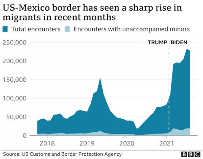 △英国广播公司(BBC)网站截图: 2020年4月以来,边境的移民人数一直在增加,拜登上任后,这一数字急剧上升。