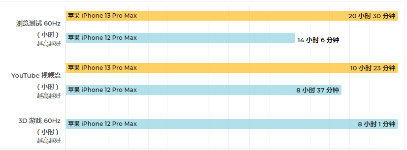 请注意,以上是苹果官网给出的数据,可能与现实使用中有所差异,通过我们的测试,下图显示了 iPhone 13 Pro Max 与 iPhone 12 Pro Max 的电池续航差异: