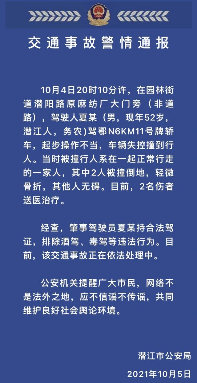 10月5日傍晚,潜江公安局发布交通事故警情通报称,10月4日20时10分许,在园林街道潜阳路原麻纺厂大门旁(非道路),驾驶人夏某(男,现年52岁,潜江人,务农)驾鄂N6KM11号牌轿车,起步操作不当,车辆失控撞到行人。当时被撞行人系在一起正常行走的一家人,其中2人被撞倒地,轻微骨折,其他人无碍。目前,2名伤者送医治疗。