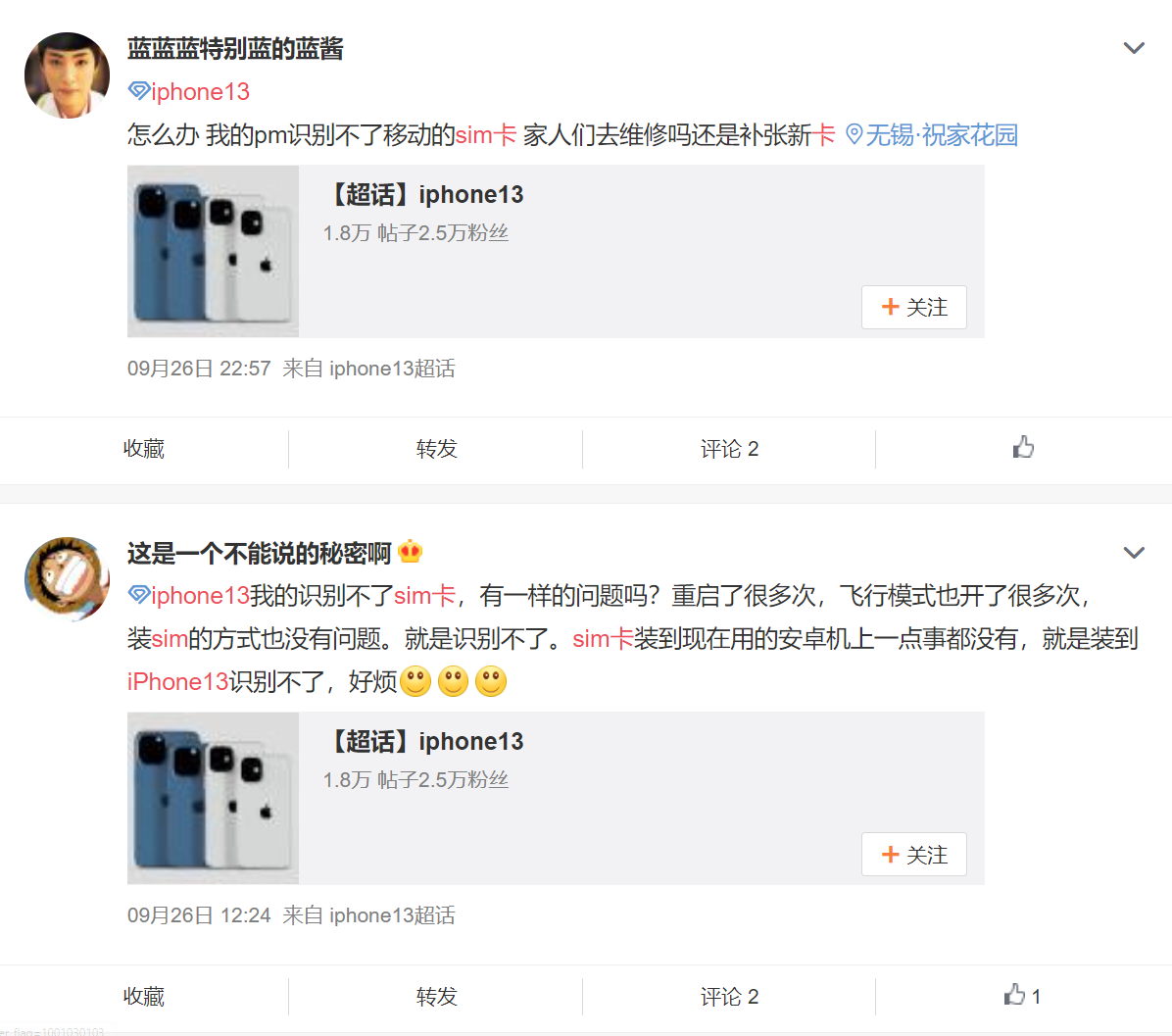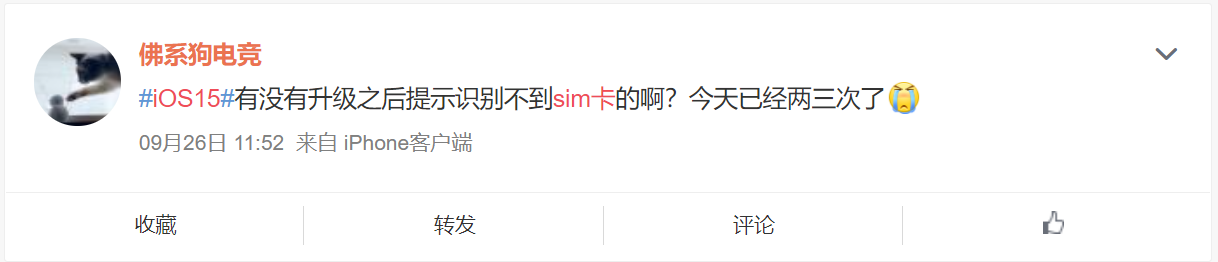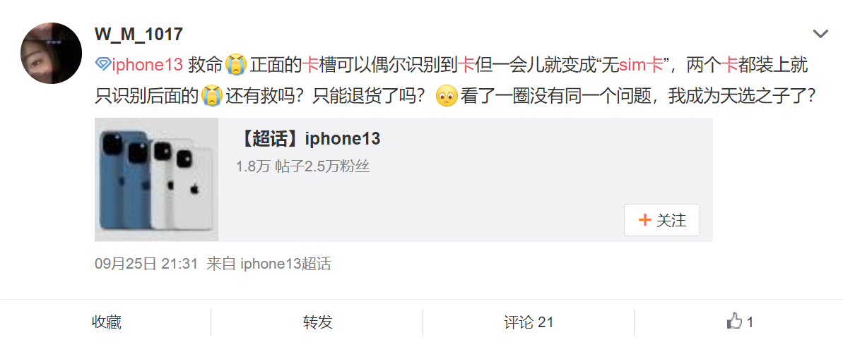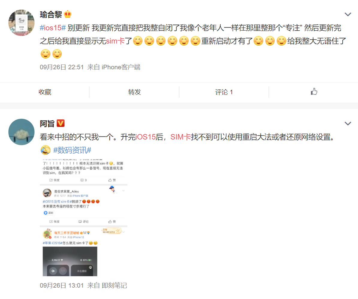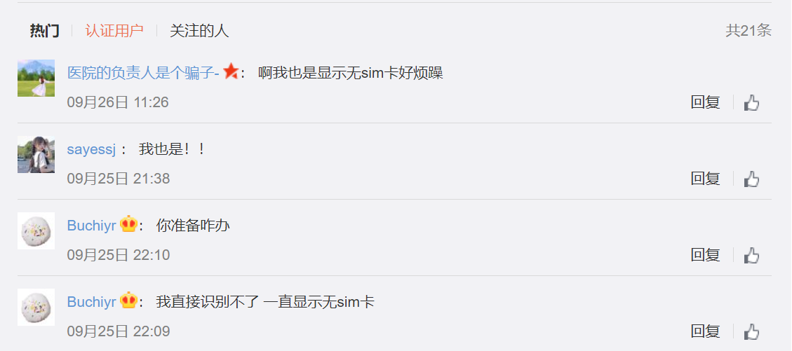 然而不止 iOS 15,在微博简单搜索即可发现,部分 iPhone 13 用户也遭遇了“无 SIM 卡”的问题,有用户称即使重启也识别不了 SIM 卡,由于 iPhone 13 预装 iOS 15 系统,而 iOS 15 遇到该问题后大部分可重启解决,因此可能是手机本身的问题,目前该问题的影响范围没有像 iOS 15 那样广泛,苹果也还未对此对出回应。