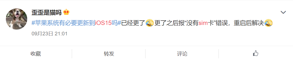 根据不少网友在微博反映,升级 iOS 15 正式版后,手机左上角出现“无 SIM 卡”的提醒,有网友称切换到飞行模式也无法解决问题。值得庆幸的是,不过不少网友反映,只需要重启手机即可解决该问题。