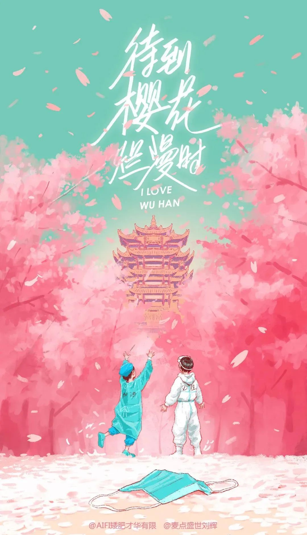 来自不同职业、不同纬度人们的反馈给了态爷信心,他的画正在人们的传播和注释中得到了新的诠释。还有什么是不可战胜的呢?“接下来画樱花吧”,一位网友用留言提醒态爷。冬天寒冷漫长,但春天总会如期而至。1月29日,态爷发布了新画:黄鹤楼矗立在粉白色樱花花海中,正是春暖花开的轻盈时节,医护人员们摘掉了口罩。他给这张画取名为《待到樱花烂漫时》。