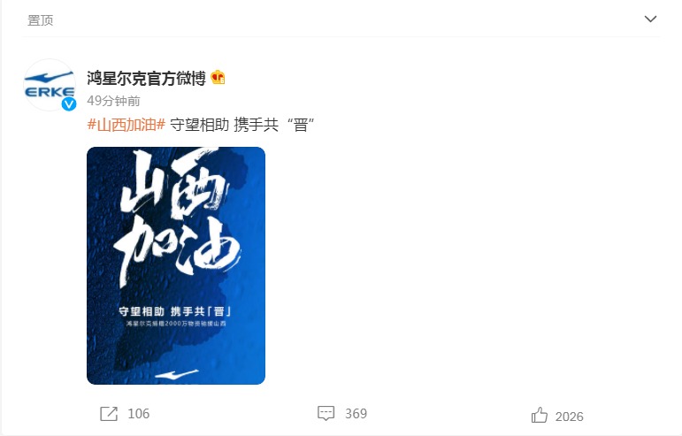 据鸿星尔克官方微博10月10日晚间消息,鸿星尔克宣布捐赠2000万物资驰援山西。