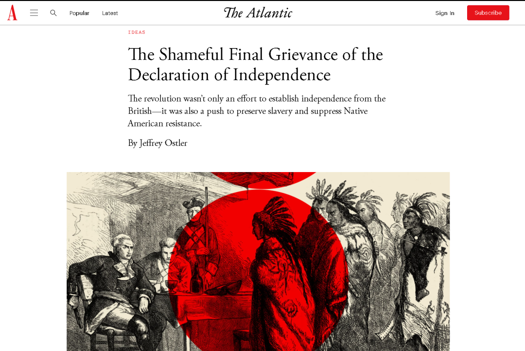 《大西洋月刊》这篇文章还指出,正是受到这么一份“独立宣言”的“感召”,当时很多担心奴隶起义、或是正在从印第安人那里抢夺地盘的白人殖民者,才纷纷加入了美国的独立战争,一起战胜了英国人,创建了美国,为美国完成了“原始积累”。