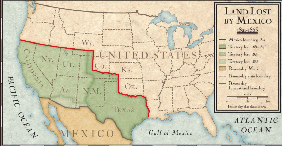 (图为被美国侵吞和抢夺走的墨西哥版图,图片来自网络)