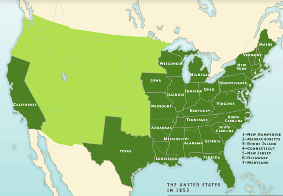 至此,到了1853年,美国的版图已经扩张到下图这种程度,非常接近如今美国本土的版图了。