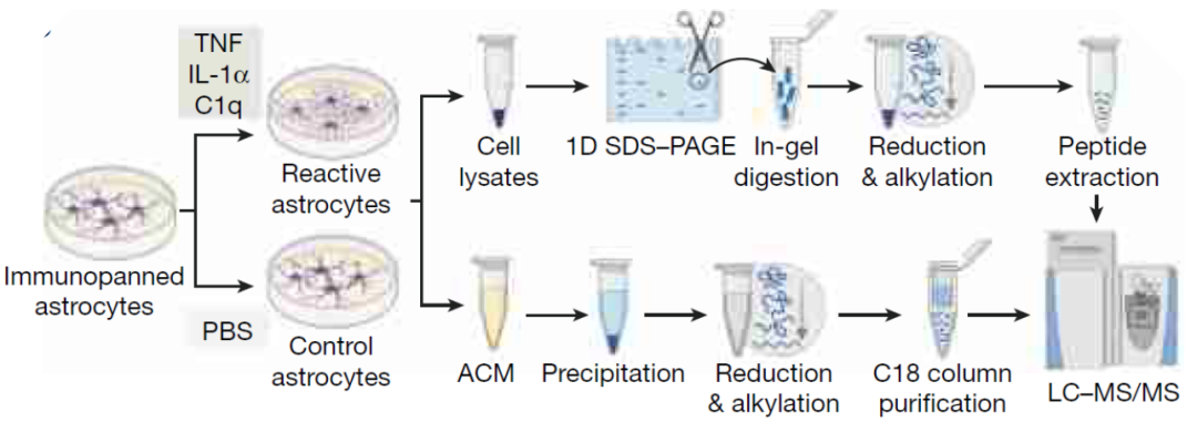 之前有研究表明反应性星形胶质细胞的毒性是由分泌蛋白介导的【1-2】。为了鉴定具体的毒性因子,作者分析了反应性胶质细胞和对照组(静息)胶质细胞及星形胶质细胞条件培养基(Astrocyte conditioned medium,ACM)中蛋白质丰度的变化情况(图1),并使用成熟的少突细胞来评估ACM的毒性。质谱数据显示,在检测到的3,660个蛋白质中,有176个蛋白质在反应性星形胶质细胞内发生改变。关于星形胶质细胞中的分泌蛋白,除了之前已经报道过的因子如SPARC外【3】,作者还观察到了反应性ACM中其他因子的变化,例如C3,lipocalin-2,以及其他反应性标志物【4】。出乎意料的是,毒性评估实验显示,这些因子并不会引起少突细胞的死亡,说明真正的毒性因子并没有找到。但作者注意到反应性ACM中富含脂蛋白APOE和APOJ,提示星形胶质细胞中的脂代谢可能发生了变化。