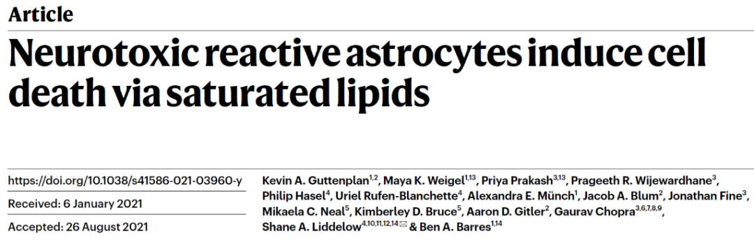 2021年10月6日,来自美国斯坦福大学的Ben A. Barres团队与纽约大学医学院的Shane A. Liddelow团队合作在Nature杂志在线发表了题为Neurotoxic reactive astrocytes induce cell death via saturated lipids的研究论文,揭示了一种新的机制来阐释星形胶质细胞如何杀死中枢神经系统中的细胞。