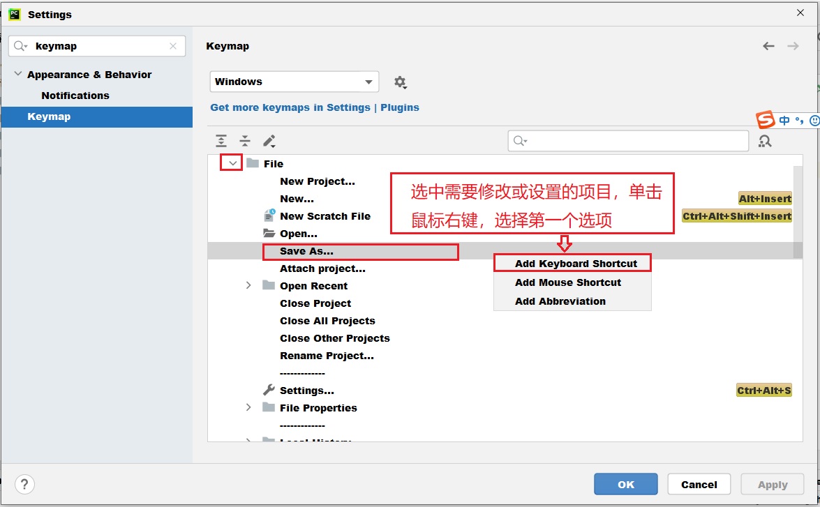 1、File->setting->keymap