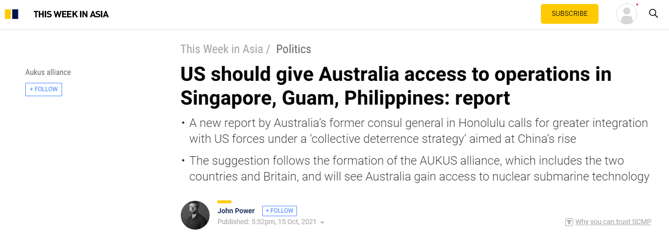 据香港《南华早报》15日报道,在上月15日成立的“澳英美联盟”(AUKUS)框架规定美英两国将帮助澳大利亚建造核潜艇后,澳大利亚一机构15日发布一份最新报告,声称美澳两国军队应根据一项针对中国崛起的“集体威慑战略”进一步整合,使堪培拉方面能够参与美国在菲律宾、新加坡、关岛的行动。