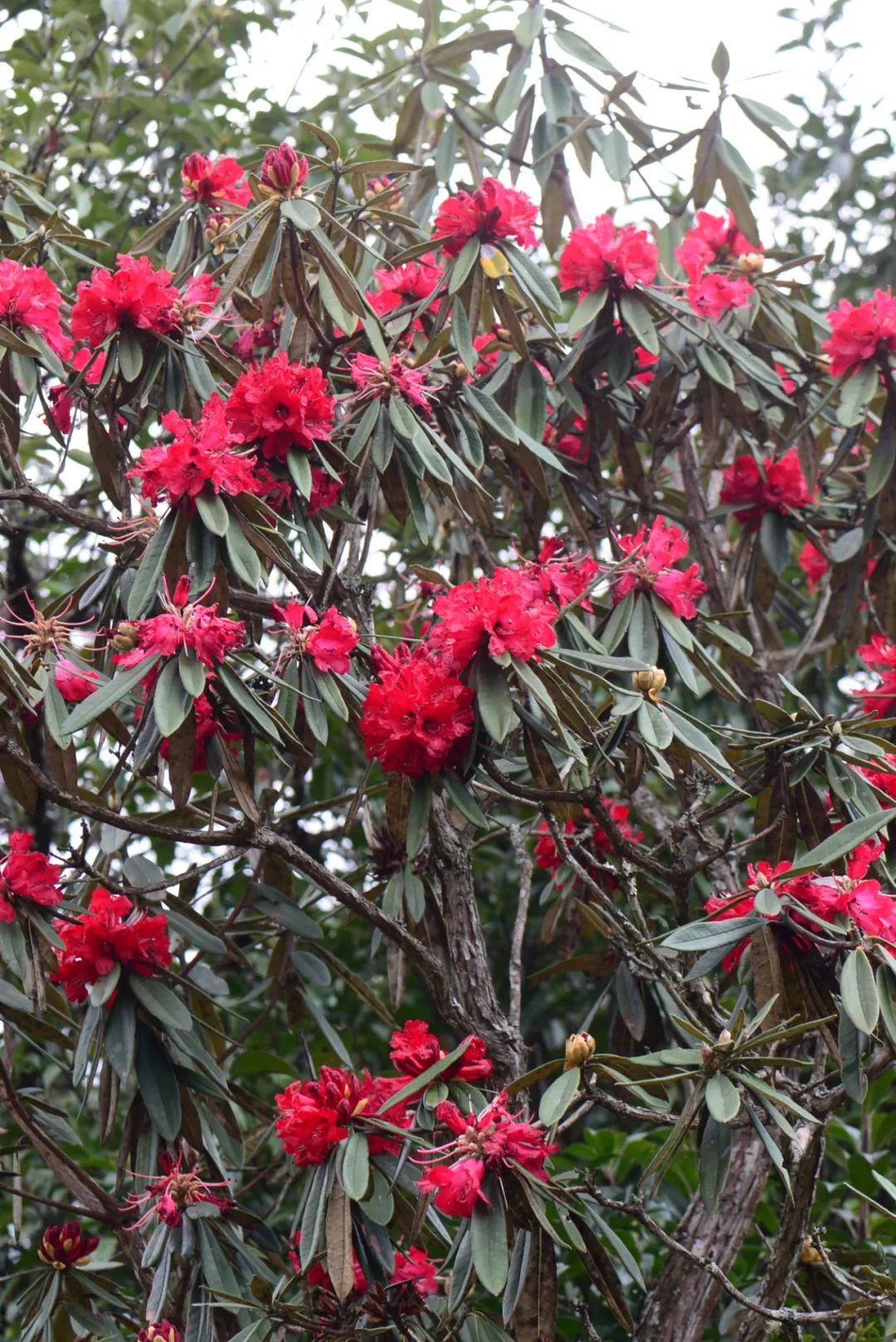 杜鹃花主要分布在滇西、滇西北海拔3000米左右的高山区域。因为生活海拔不同,杜鹃花有完全不同的形态:在高海拔区域,它们会变身垫状灌木;而在温暖潮湿的区域,它们会长成大树的模样。花朵的大小和颜色更是多种多样,从米粒大小的紫色花,到碗口大小的乳白色花,再到把整个山坡都“点燃”的火红色的花,不一而足。