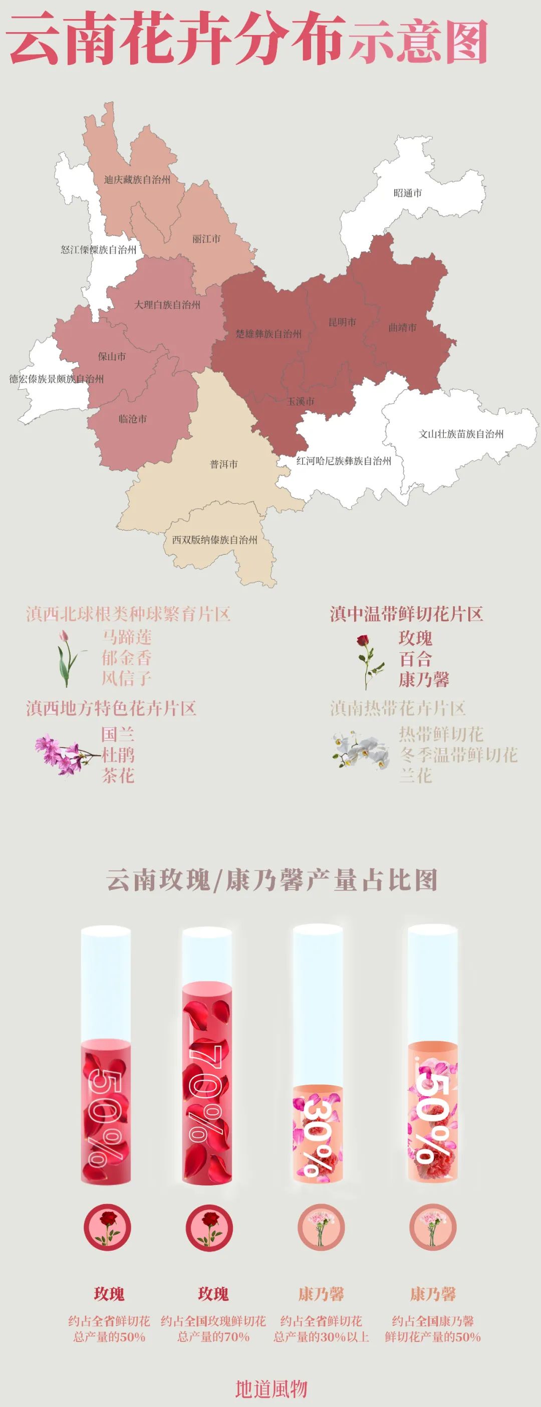 云南花卉分布,及玫瑰、康乃馨产量占比。