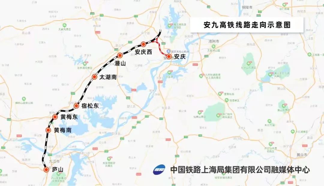 安九高铁跨安徽、湖北、江西三省,全线设安庆西、潜山、太湖南、宿松东、黄梅东、黄梅南、庐山等7座车站。