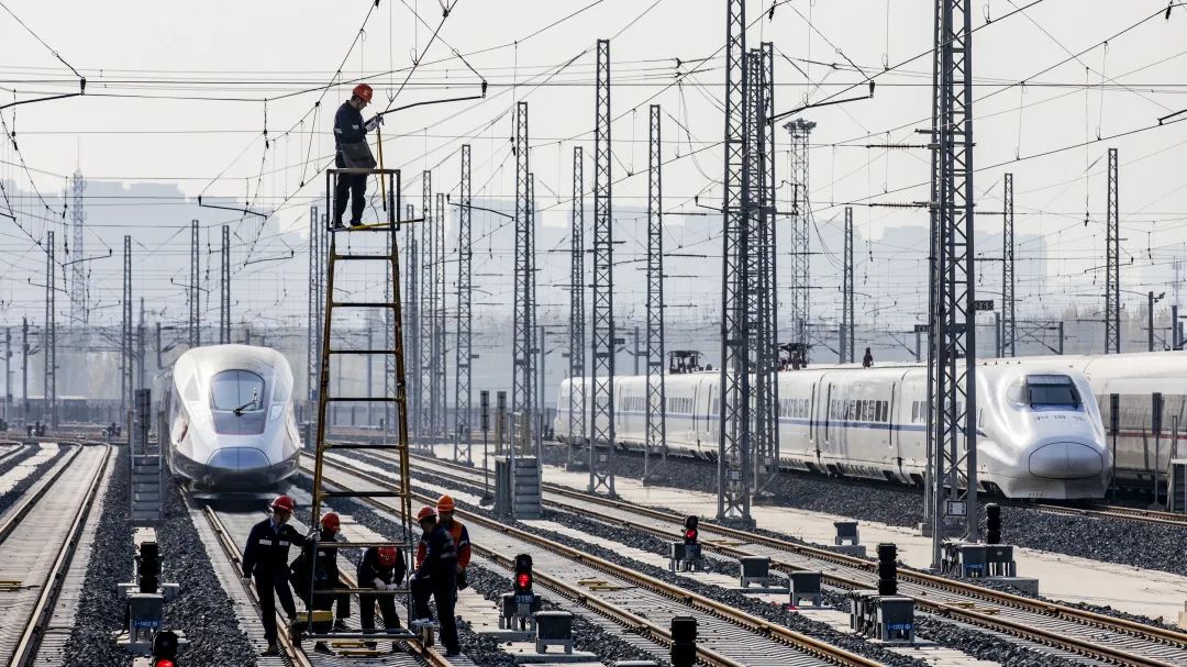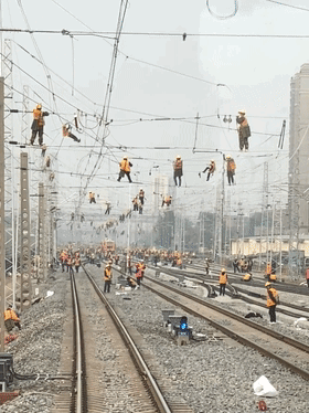这群小黄人,其实是铁路接触网工,他们又被称为铁路“蜘蛛侠”。接触网是沿铁路线上空架设的输电线路,为日常来往的车辆输送电能。接触网工通过日常检修,消除接触网潜在危险,维护铁路供电设备及行车安全。