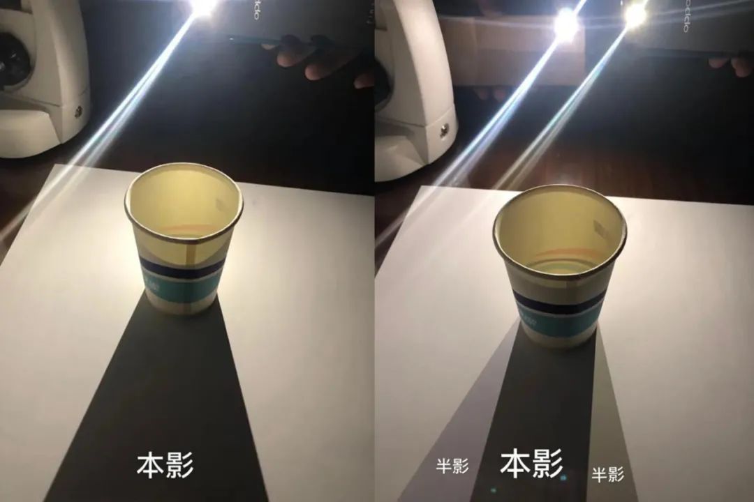 一部手机和两部手机分别照亮杯子前方的方法演示本影和半影