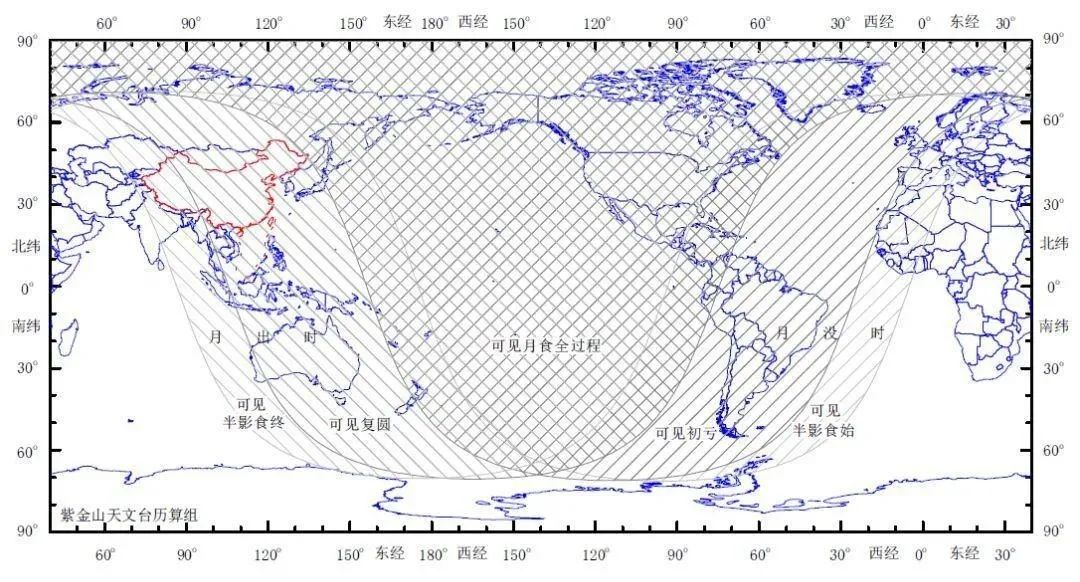 此次可见月食全程的区域在我国东侧,只有北美洲和俄罗斯东北部可以看到全程。