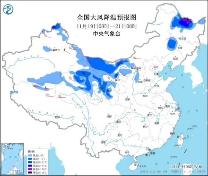 预计今明两天(11月19日至20日),受较强冷空气的影响,新疆北疆北部和东部、甘肃、青海北部、内蒙古西部和东南部、吉林西部、黑龙江北部和西部等地气温下降6~10℃,其中,新疆北疆阿勒泰地区、黑龙江北部等地局地降温10~14℃;新疆北部、西藏北部、西北地区中东部、内蒙古中西部、华北西部部分地区有5~6级偏北风,阵风7~9级。