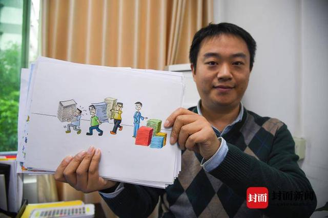 “一条板凳,四支粉笔,我便承包了小学直至大学所有的黑板报。”大学毕业工作后,他偏爱上了漫画,偶尔突发奇想,随便画两幅在朋友圈或者微信群展露一下,都会得到不少点赞,吸来众多粉丝。