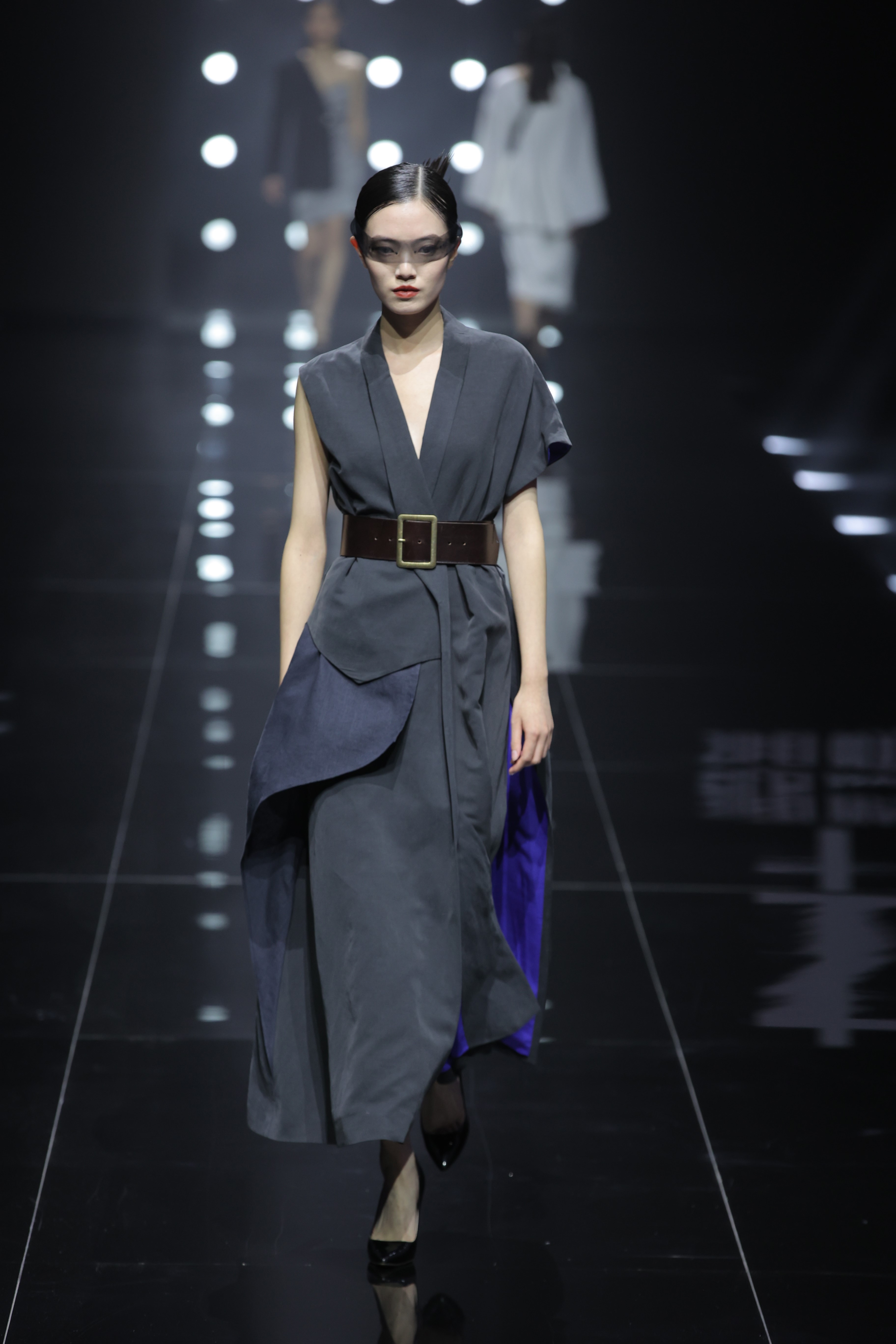 第三个系列「游牧东方」则试图探索经典与创新、过去与未来的边缘,以相对前两个系列更为夸张的礼服裙为主线。颇具未来感的面料之下,又能隐约看到精美刺绣和斑驳褶皱的表达,实现飘逸感与层次感的完美结合。国风改良式衬衫套装灵感来自紫禁城的红墙黑瓦:神秘飘逸的黑纱与禁欲系改良式衬衫搭配出的反差感,让龙纹印花所揭晓的国风暗示出特别的神秘趣味;褶皱斗篷套装运用了斑驳、做旧的(特殊工艺)提花牛仔面料,灵感源自紫禁城的历史星空,而腰封与兜却采用了未来感十足的TPU透明反光面料,形成古典与未来的鲜明反差。多层次褶皱与经过二次改良的粗布在此系列中得到充分利用,也成为本季的重要看点之一。