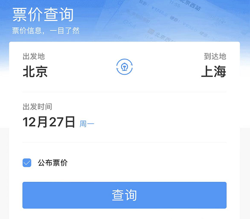 公布票价如何查询?进入铁路12306APP首页→更多→出行向导→查票价。输入票价查询的出发地、到达地和出发时间,勾选公布票价后,点击查询即可。