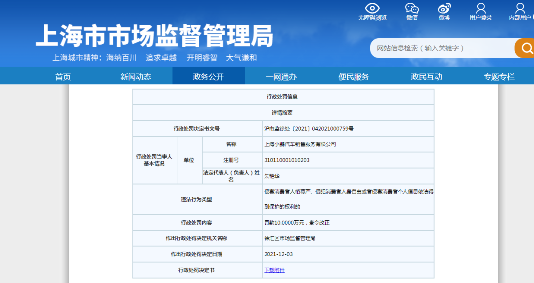 从上海市市场监管局获悉,近日,上海小鹏汽车销售服务有限公司被上海市徐汇区市场监督管理局罚款10万元。