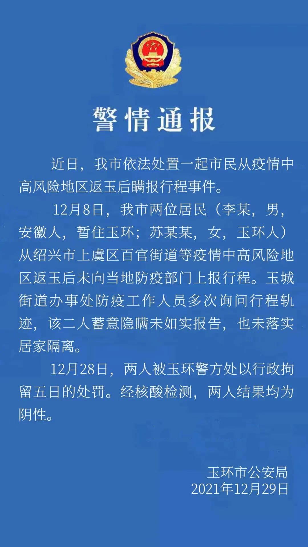 12月28日,两人被玉环警方处以行政拘留五日的处罚。经核酸检测,两人结果均为阴性。