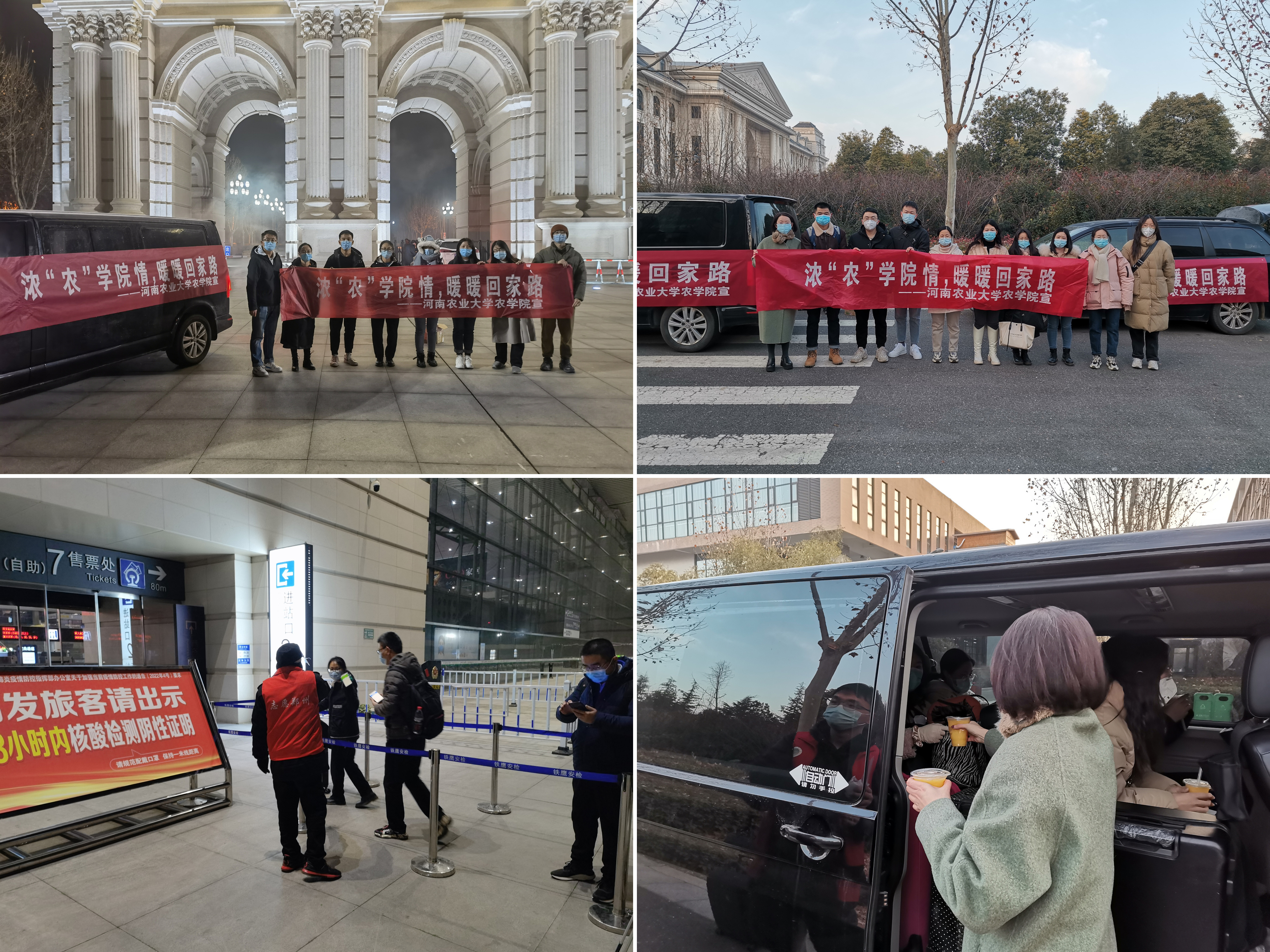 1月15日凌晨5时45分,河南农业大学农学院第一辆护送专车出发,并于6时10分顺利护送6名研究生抵达郑州高铁东站。据悉,农学院共有323名研究生留校,提出离校返家申请的学生中,符合郑州及目的地疫情防控要求的有310人。春节前,学院将根据学生具体出行安排,派出专车“点对点”将离校返家学生护送至高铁站、飞机场、高速口,切实做好学生安全返家“最后一公里”的安全保障工作。