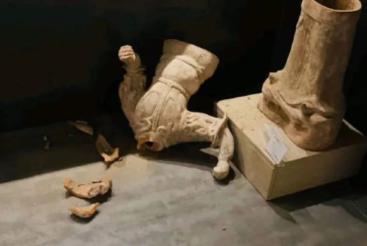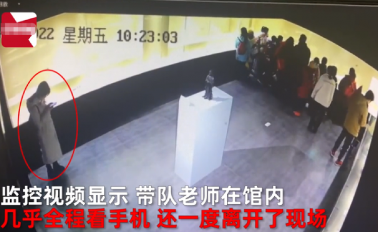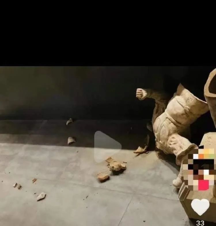 通过监控画面可以看到,当时有一些学生和老师正在该私人博物馆的展厅内参观,四周都是玻璃展柜,展厅中间有一个半人高的展台,上面有一尊人物小雕像。但这座雕像并没有被触碰,反而是展厅墙角处一尊并不起眼的约1米高的人像雕塑,一个男孩走过去时疑似碰到雕塑,雕塑突然拦腰截断,上半部分掉落砸碎。
