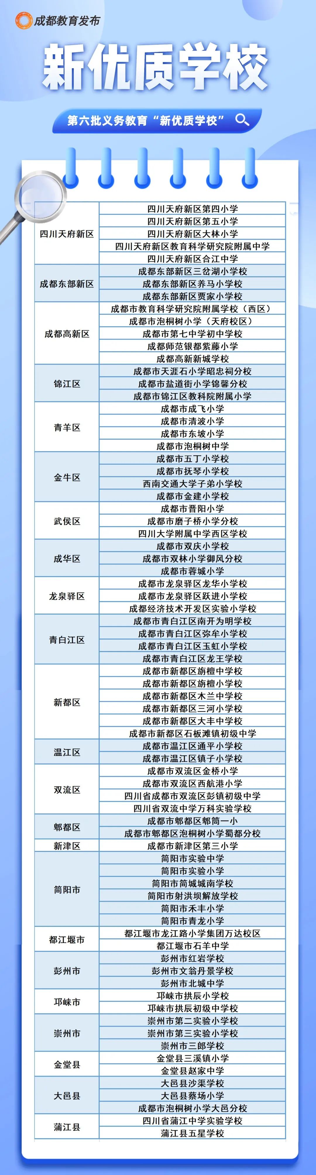 今日,成都市教育局公布全市第六批义务教育“新优质学校”名单,成都七中初中学校等75所学校被认定为全市义务教育“新优质学校”(名单附后),截至目前,全市义务教育段各类优质学校已达612所。到“十四五”末,全市义务教育优质资源覆盖率将达70%以上。