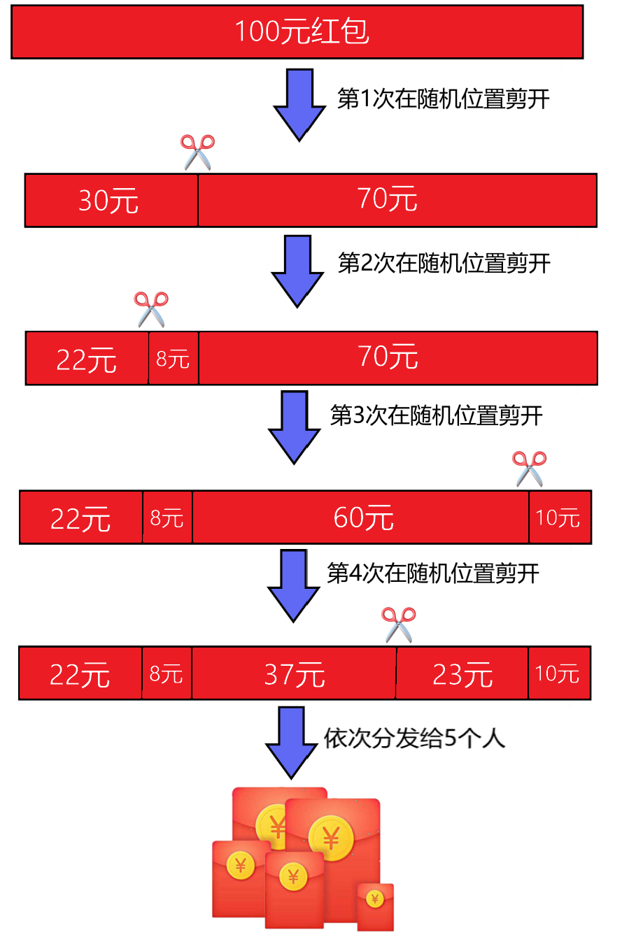 于是,我们不妨用100米的绳子来代表100元钱,如果有20个人抢红包的话,就在绳子上随性地剪上19刀,将它分成长短完全随机的20份,每个人再随机地领一份走,绳子越长就代表金额越多。
