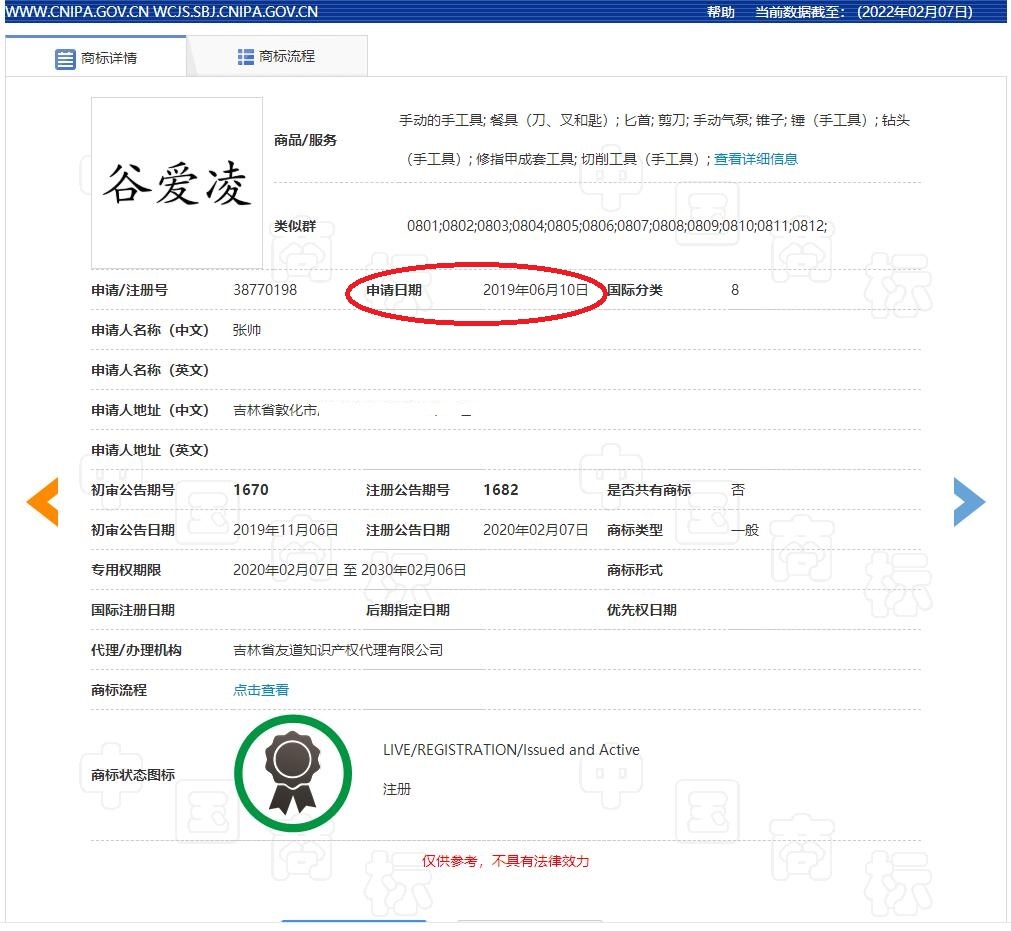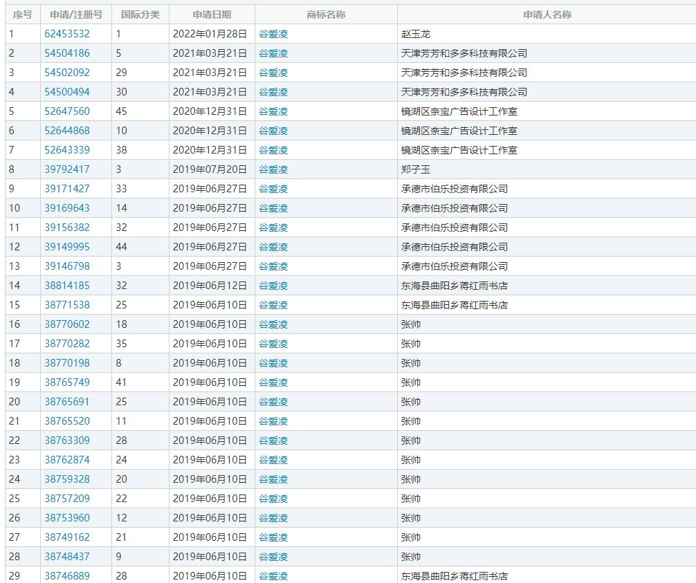 记者在中国商标网上输入“谷爱凌”进行查询,显示截至2022年2月7日“谷爱凌”商标名称有29件。其中,吉林省敦化市的张帅通过吉林省友道知识产权代理有限公司申请的13个“谷爱凌”商标中的11个已经注册成功。其他的“谷爱凌”商标或被驳回或等待实质审查。