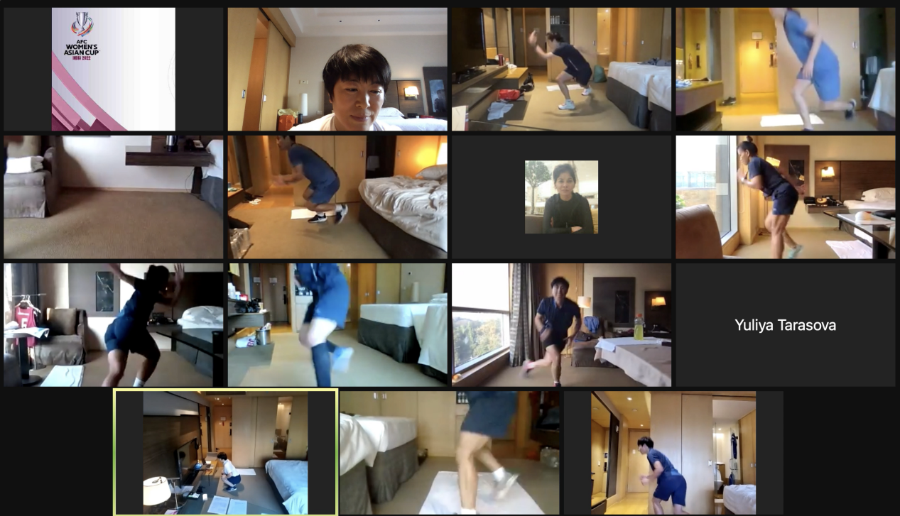 张玲玲:这次比赛作为裁判管理队伍,共有5名裁判长、4名讲师,其中2名体能讲师、2名技能讲师。体能讲师由我和乌兹别克斯坦的同行担任。我们先后为32名场地裁判员、7名视频裁判员进行体能训练。作为主讲师,我的主要任务是保证裁判员的体能能够胜任赛场上的执法任务。足球比赛对裁判员体能的要求是很高的,他们平均每场奔跑都在10000m以上,而且还要不停地转换方向,变换观察角度,根据数据统计,一场比赛对裁判员体能要求甚至高于运动员,所以足球项目裁判员不是终身制的,每年要根据执法表现和体能测试等重新申报,这次赛事前我们也对主裁和助理分别进行了DYY和ARIET的测试。整个赛事期间,我们体能讲师要根据每位裁判员被指派的执法场次的时间进行不同类型和强度的训练,每天大约2小时,主要以灵敏、力量、速度、有氧耐力跑、伤病预防和恢复训练等训练种类为主,保证他们的体能状态处于一种最佳状态。