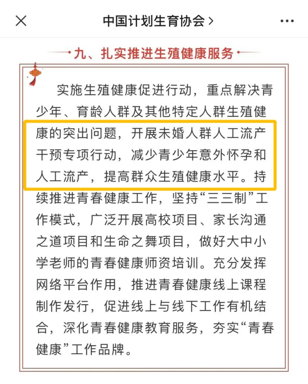 近日,中国计划生育协会发布《中国计划生育协会2022年工作要点》,其中第九条提到“开展未婚人群人工流产干预专项行动”。