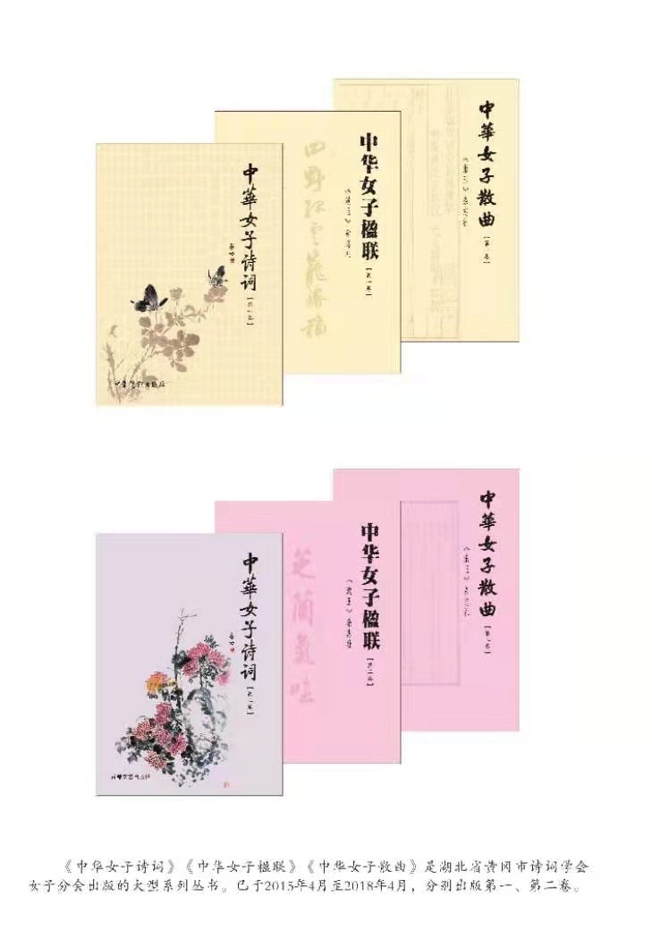 黄冈市诗词学会女子分会、东坡赤壁诗社女子诗词分社还出版了每卷16开19印张的《中华女子诗词》《中华女子楹联》《中华女子散曲》系列丛书各二卷共六卷,共办了中国大陆除西藏外所有省、自治区、直辖市、香港以及美国、加拿大等地的华人女诗人共763人专页,每位最少刊用作品一页,最多6页,共刊用其诗、词、曲、联12300多首、副。填补了中华女子诗词史上的空白。湖北省楹联学会三次写入理事会会长工作报告,肯定其对中华女子楹联作出的突出贡献。