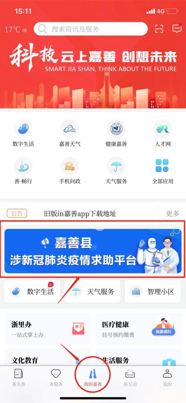 打开“in嘉善2.0”手机客户端,进入“我的嘉善”,点击图示位置,进入填写界面,填写求助信息即可。