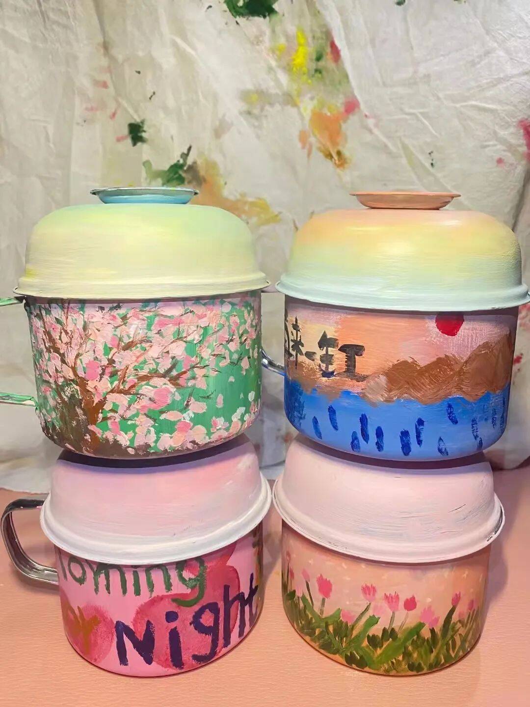 同学们用画笔涂上喜欢的颜色,大肆发挥自己的想象。原本沉闷的表面,在五彩线条一点点交接起时,也变得立体、丰满起来一个个餐盒变成一件件专属的“艺术品”。