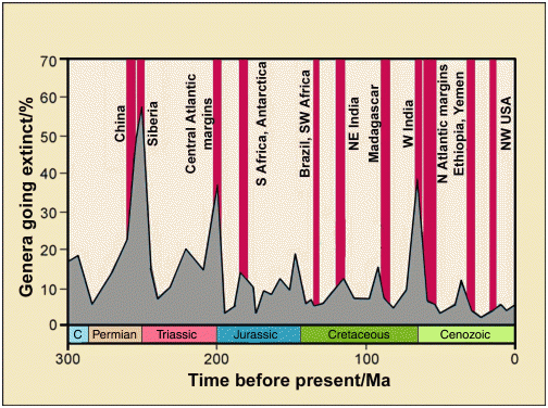 图6. 红色为溢流玄武岩喷发时代,灰色为生物绝灭的百分比。几个突出的绝灭峰几乎都和红色条带吻合(图源Posts about flood basalts on)