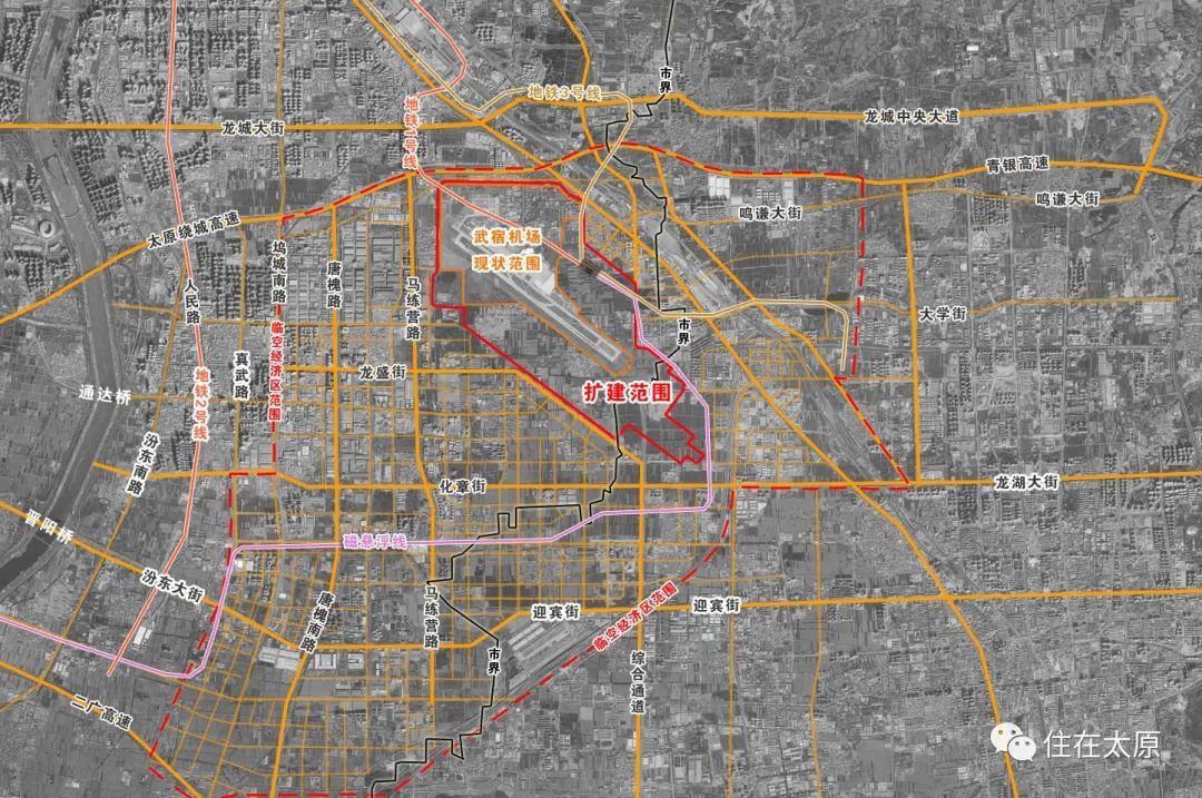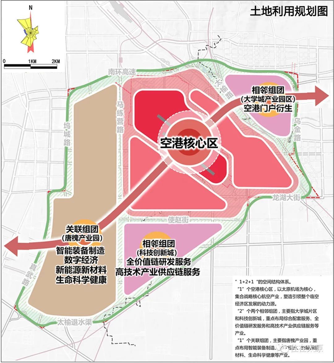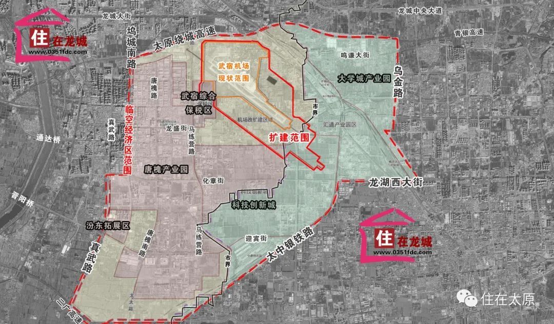 从中获悉,太原机场临空经济区四至为:北至南环高速,西至大运路-真武路,南至太长高速-太榆退水渠太中银铁路龙湖大街,东至乌金路。总规划面积98.79平方公里,横跨太原、晋中两市,包含了山西大学城产业园、科技创新城、唐槐产业园、武宿综合保税区、汾东拓展区等多个产业园区。