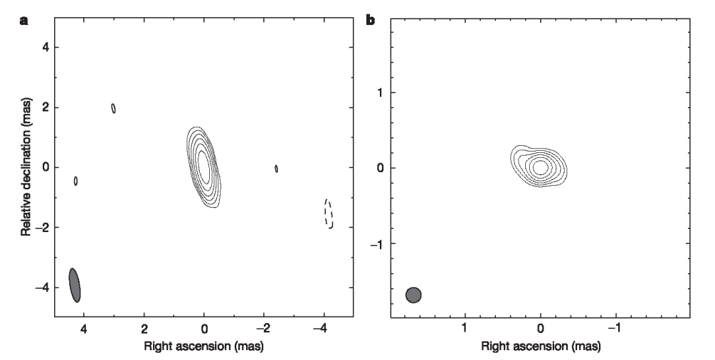 图二:Sgr A*在3毫米的CLEAN图像,左右两图分别对应使用椭圆和圆状洁束重建的图像(图片来源:沈等人 2005)