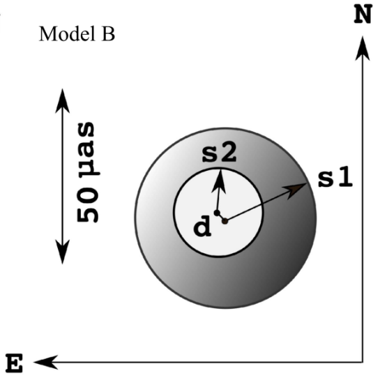 图三:Sgr A*的致密结构的模型示意图(图片来源:路如森等 2018 [注:由于合作者作梗为首次黑洞成像结果预留空间,原论文中无法发表模型拟合的最优图像,只能使用灰色示意图。])。