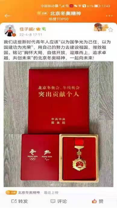 任子威曾多次在国际级比赛中获得短道速滑个人及集体项目的金牌。特别是在本届北京冬奥会期间表现优异,先后获得短道速滑项目2000米混合团体接力和男子1000米两枚金牌,充分体现了胸怀大局、自信开放、迎难而上、追求卓越、共创未来的北京冬奥精神。“我们这些新时代青年人应该以为国争光为己任,以为国建功为光荣,用自己的努力去建设祖国、报效祖国。铭记胸怀大局、自信开放、迎难而上、追求卓越、共创未来的北京冬奥精神,一起向未来!”任子威在荣获北京冬奥会、冬残奥会突出贡献个人后在朋友圈发表感言。