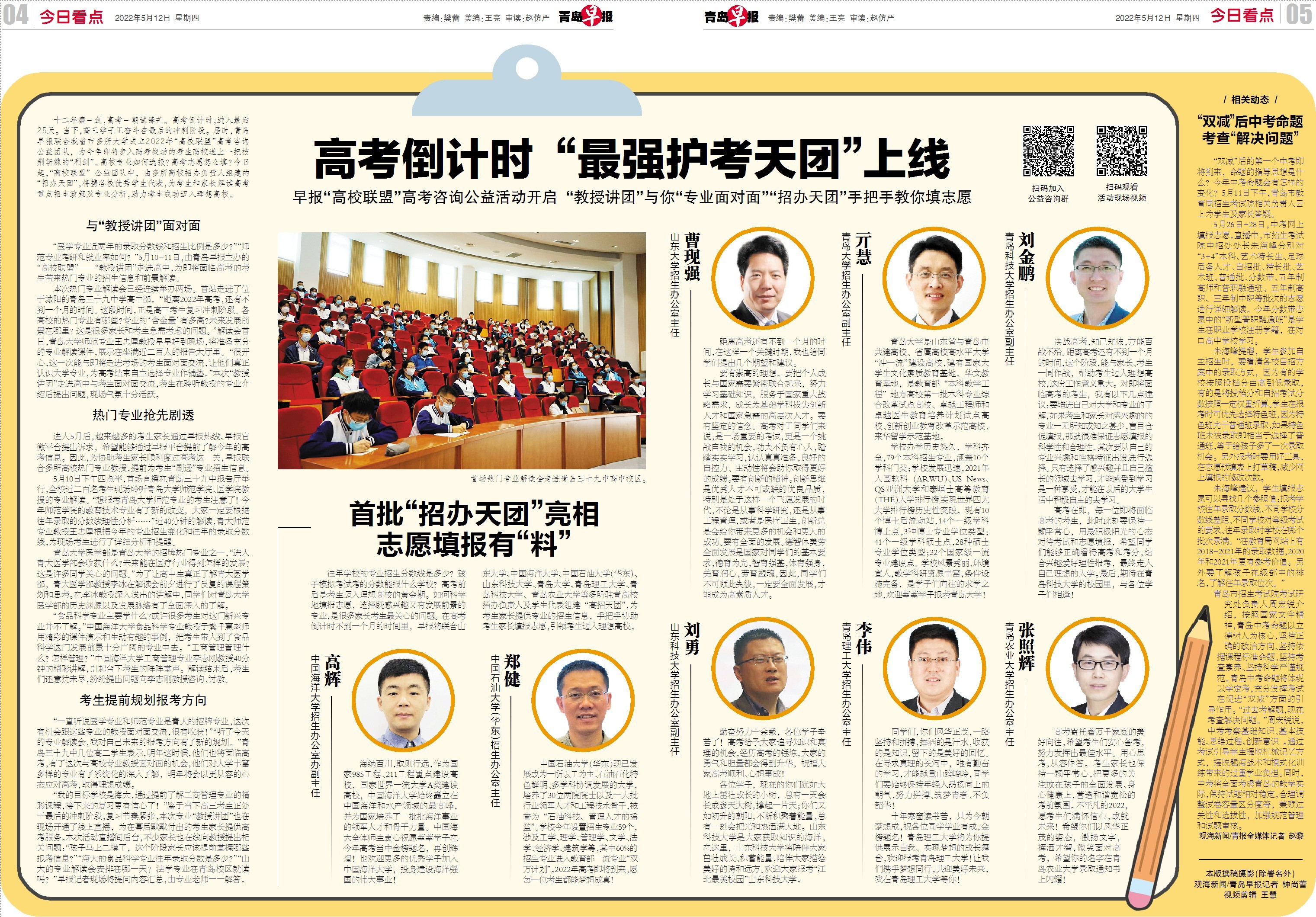 十二年磨一剑,高考一朝试锋芒。高考倒计时,进入最后25天。当下,高三学子正奋斗在最后的冲刺阶段。青岛早报联合多所大学成立2022年“高校联盟”高考咨询公益团队,为今年即将步入高考战场的考生送上一把披荆斩棘的“利剑”。高校专业如何选报?高考志愿怎么填?今日起,“高校联盟”公益团队中,由多所高校招办负责人组建的“招办天团”,将偕各校优秀学生代表,为考生和家长解读高考重点招生政策及专业分析,助力考生成功迈入理想高校。