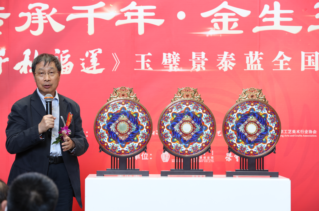 北京市珐琅厂有限责任公司党总支书记、董事长谢燕华在活动致辞中说:“今年,正逢钟连盛大师60花甲之年,希望这件新作可以成为钟大师的创作新里程,而钟连盛大师与张铁成大师的这次“金生玉见”首度联袂,相信还会成为咱们工美行业的一段跨界佳话,通过这么一件创新景泰蓝作品《千秋福运》成为美谈!“