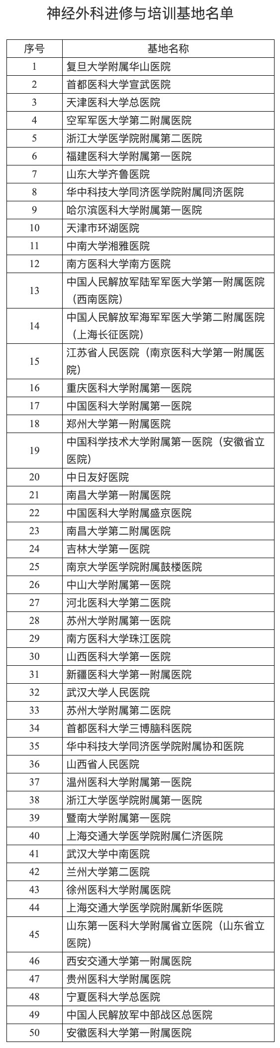 全国神经外科进修与培训基地机构名单如下: