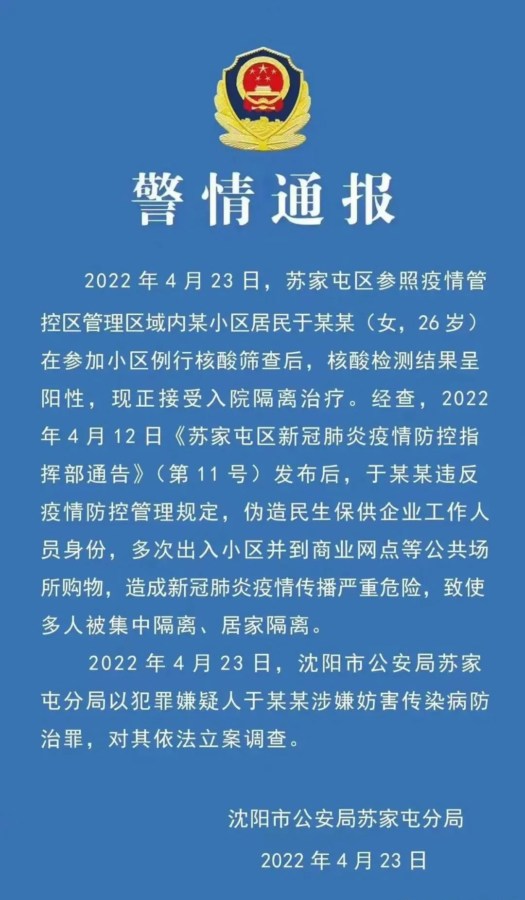 2022年4月23日,沈阳市公安局苏家屯分局以犯罪嫌疑人于某某涉嫌妨害传染病防治罪,对其依法立案调查。