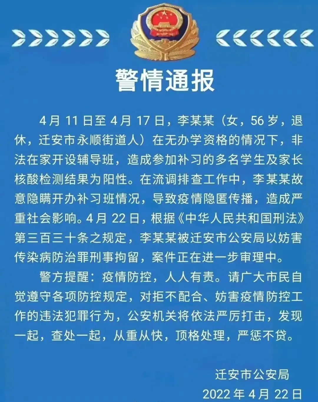 4月22日,根据《中华人民共和国刑法》第三百三十条之规定,李某某被迁安市公安局以妨害传染病防治罪刑事拘留,案件正在进一步审理中。