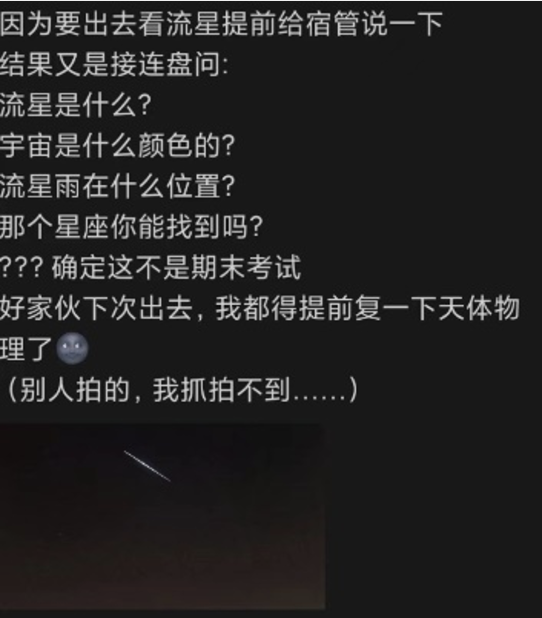 2022年4月22日,英仙座流星雨如期而至,某位作者突然想起了自己追流星雨的朋友圈。显然,如果这位博士后以上小学二年级以下知识水平的宿管再追问下去,我就要回答关于流星的更多的问题,比如说,流星落到地下是什么?流星与地球的关系等等,不过,流星到地球上的话,那就叫陨石了呀!